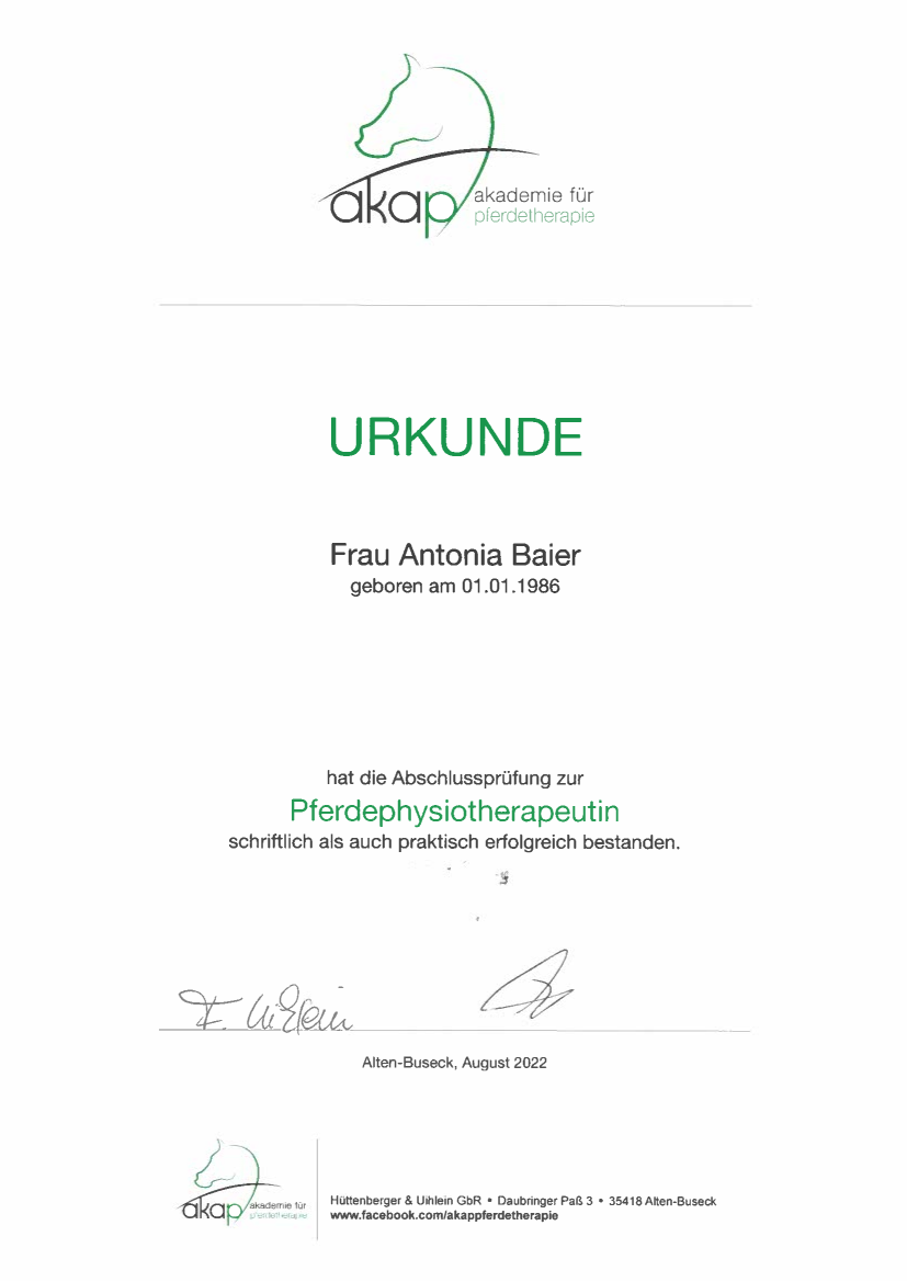 Die Pferdephysiotherapie Ausbildung hilft mir dabei, meinem eigenen Pferd ein hohes Maß an Gesundheit und Beweglichkeit zu geben. Dies möchte ich auch mit anderen Reitern und Pferdeliebhabern, sowie dem Sportpferdebesitzer teilen.
